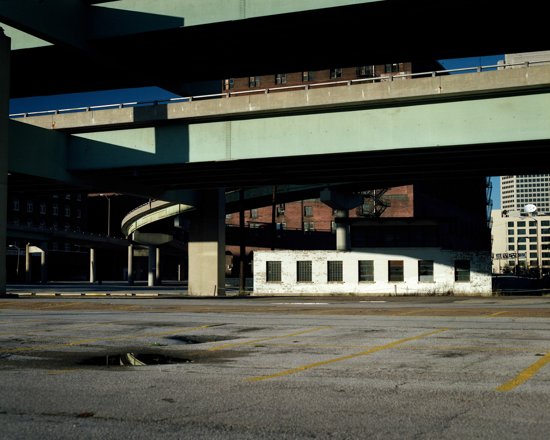 An empty parking lot underneath an overpass in downtown St. Louis. Part of a series shot one warm afternoon in November, 1988 called An Afternoon in St. Louis (a subset of my Industrial Geometry series).