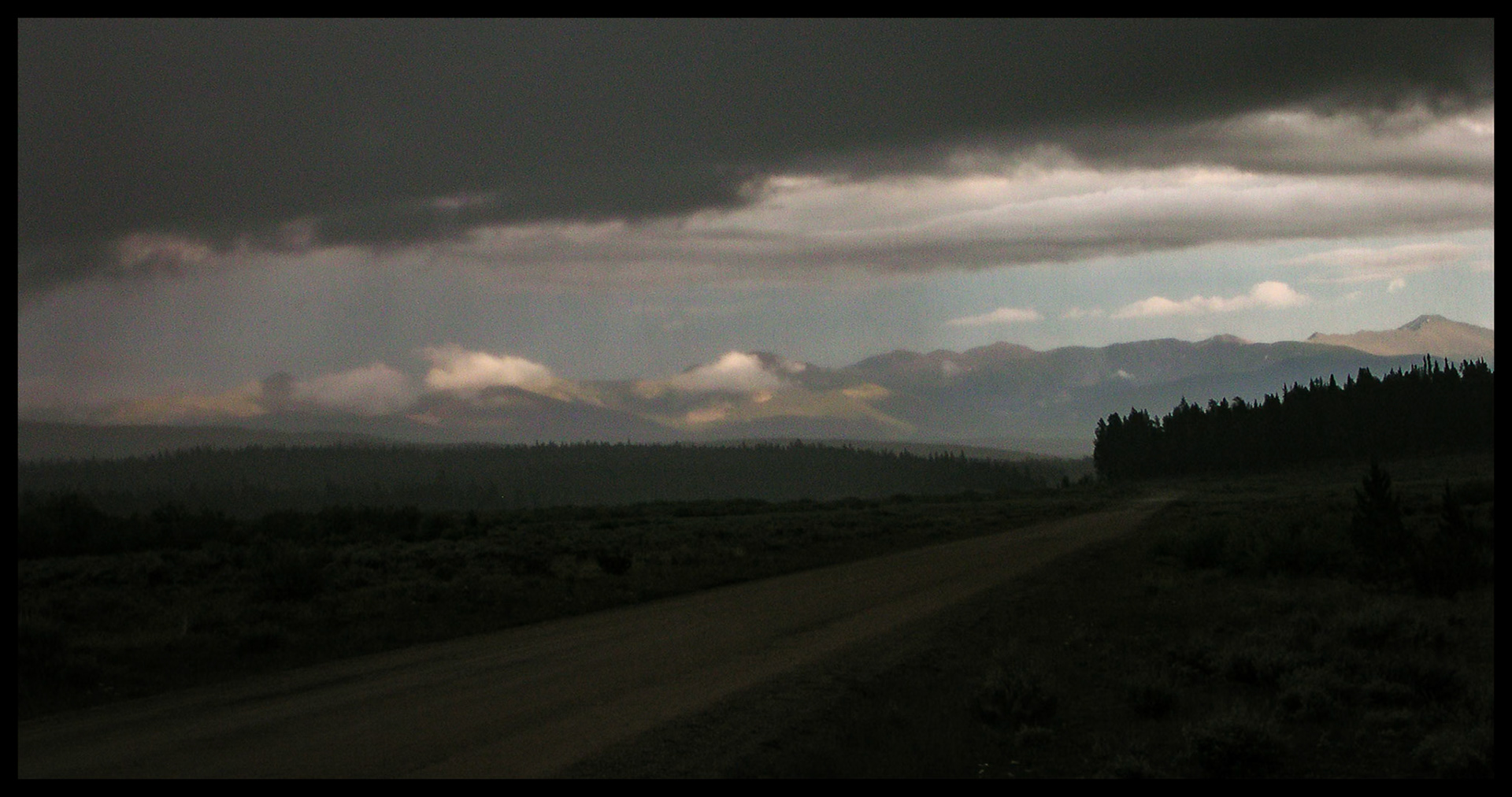 Sweeping colorful clouds and mountain range lit by the sunset with Taylor Park's Taylor Resevoir Colorado in the foreground. The mountains in the distance are part of the Collegiate Peaks in the Sawatch Range near Cottonwood Pass, near Tincup Colorado 1998