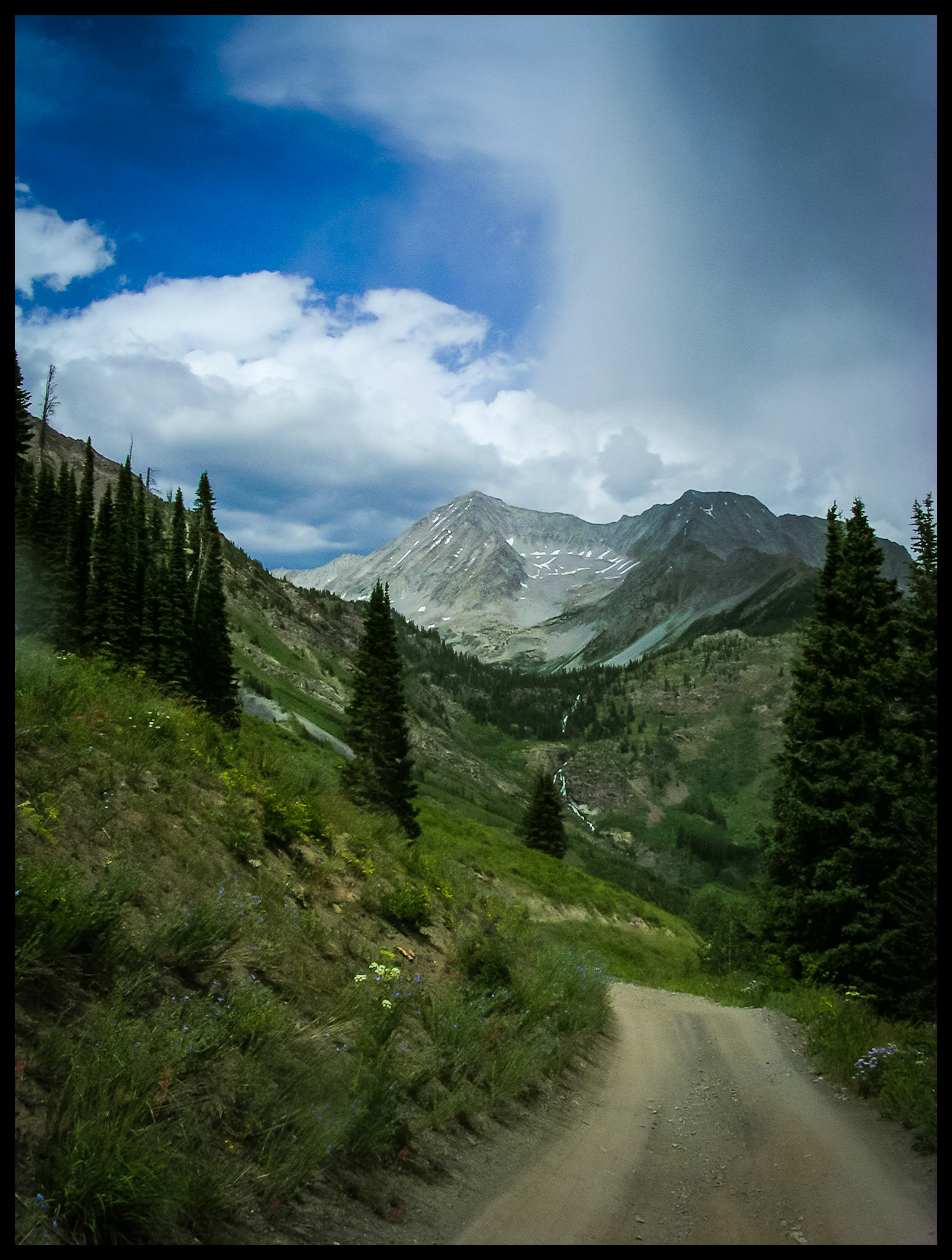 A very steep four wheel drive/ATV trail appearing to take you to the clouds at the summit of the mountain at Cumberland Pass between Tin Cup and Pitkin Colorado USA 1981