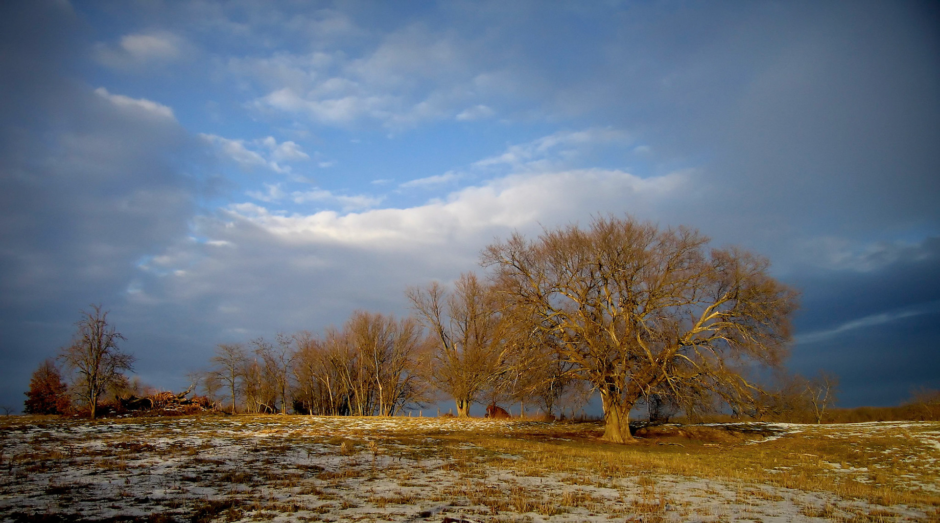 The branches of a dead tree sticking out from the surrounding live trees highlighted by the afternoon sun contrasting the dark sky behind. Near Novinger, Missouri. 2023