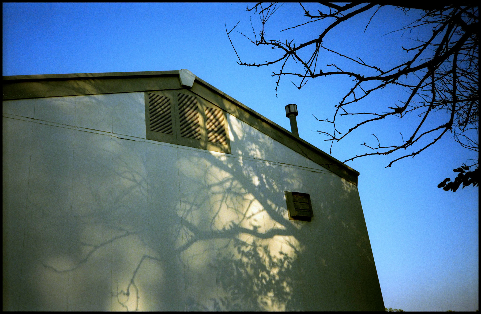 The late Autumn afternoon shadow of a neighboring house and trees blocking the warm afternoon light on the wall of a small town post office. Ethel, Missouri 2023