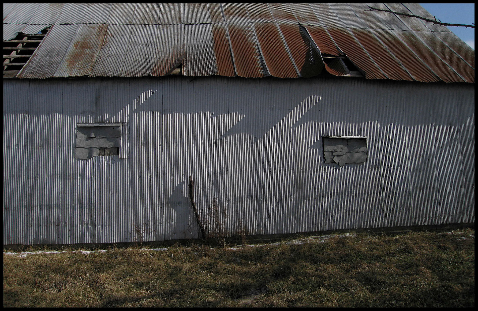 A dilapidated corrugated metal farm building with an interesting shadow cast by the evening winter sun shining on a large snow covered tree. Near Loeffler, Missouri USA 2008.
