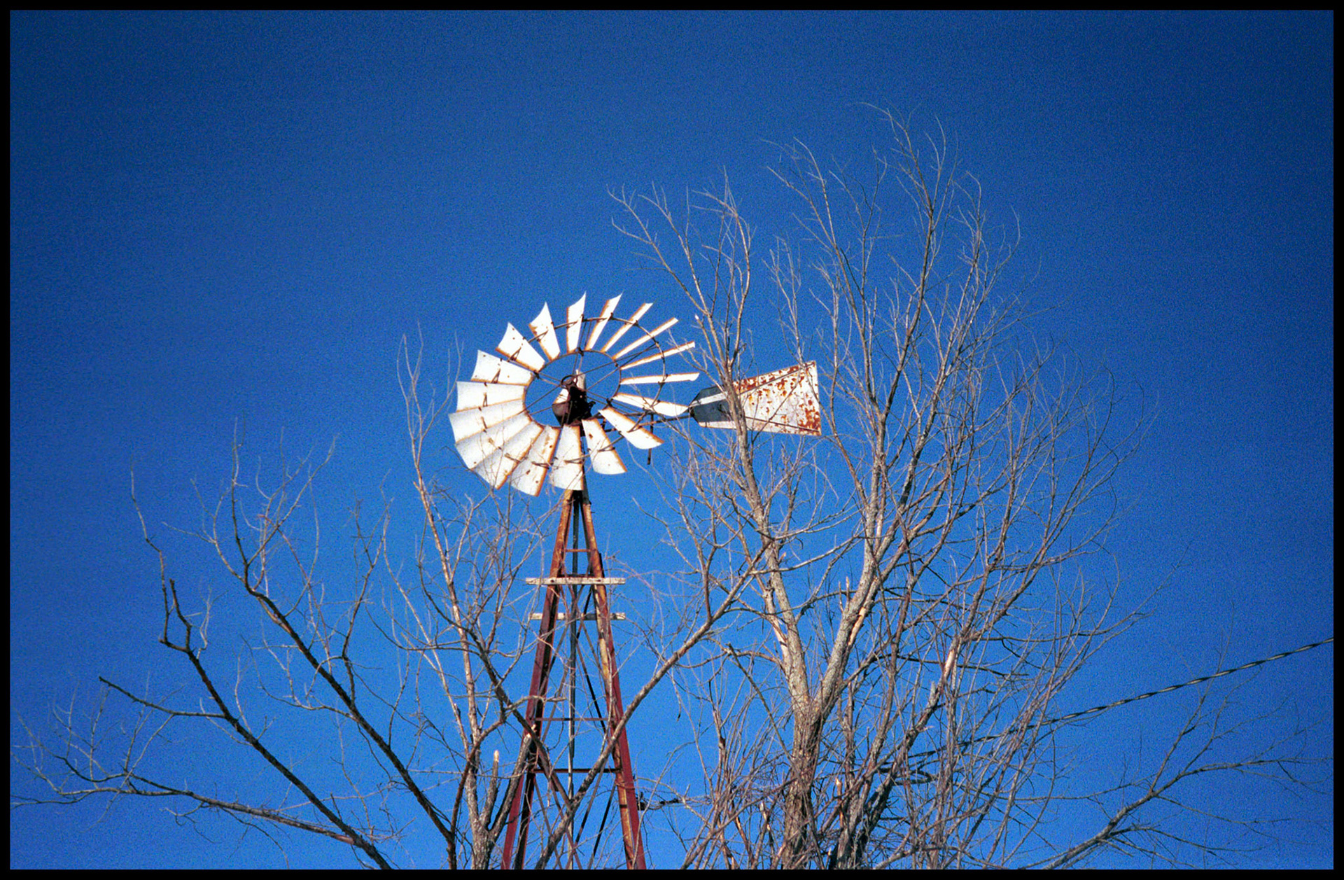 A vintage winter black and white shot of a rustic overgrown windmill in rural Missouri. Near Cherry Box, Missouri 1999