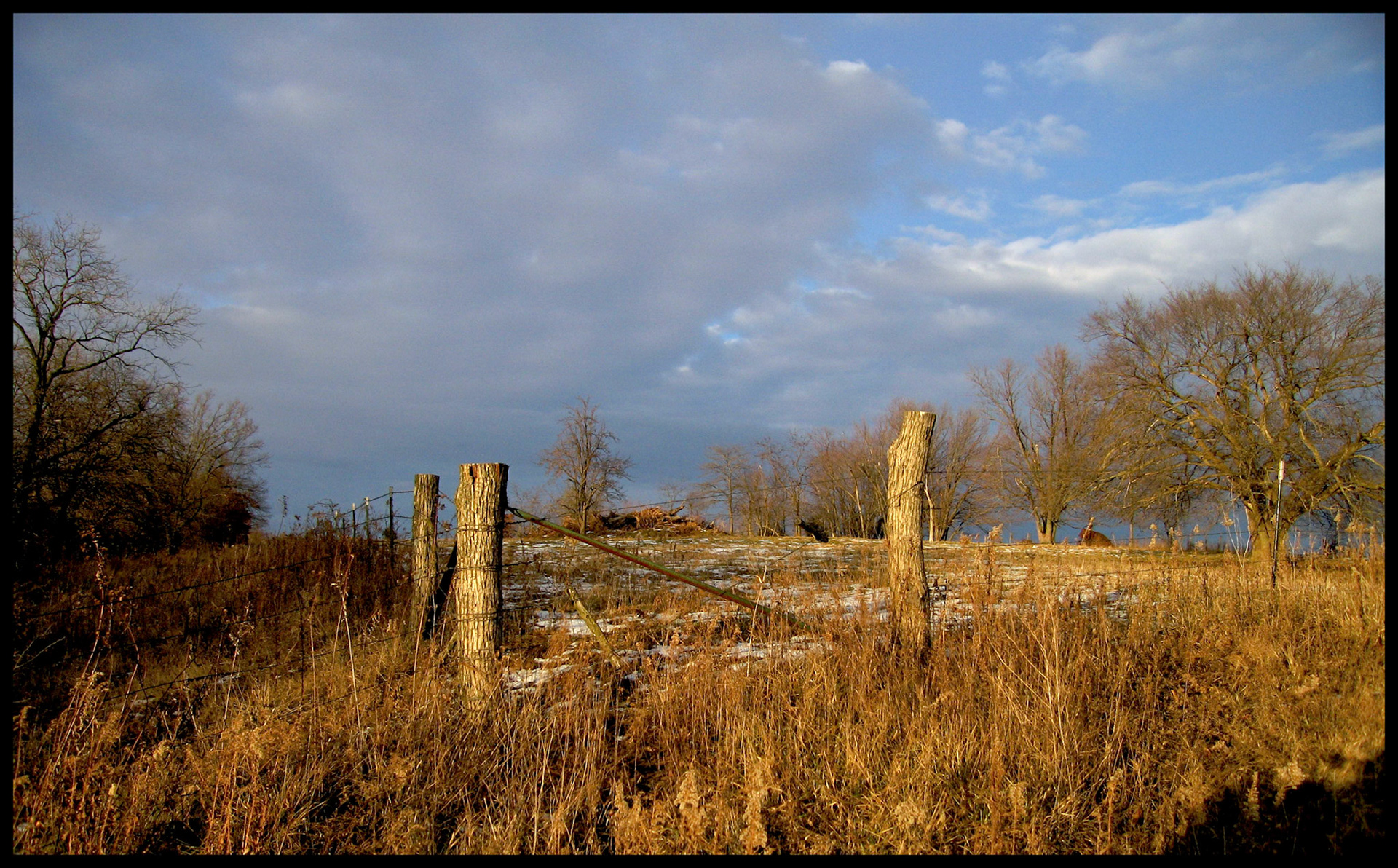 A weathered wooden fence corner gate in the warm afternoon winter light in front of a rich blue gradated blue sky with one little wisp of a cirrus cloud and golden winter grass in the foreground. Near Greencastle, Missouri USA 1984.