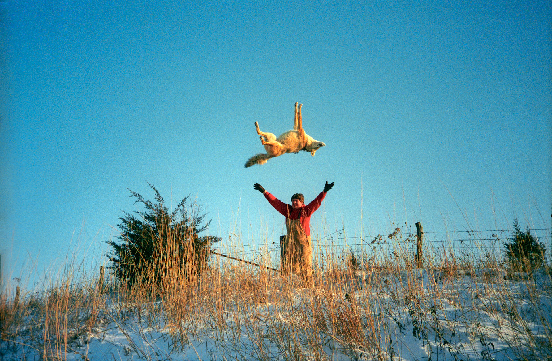 Birds circling an abandoned farmhouse on an overcast day with golden grass in the foreground. Near Bethel, Missouri, USA, 1981.